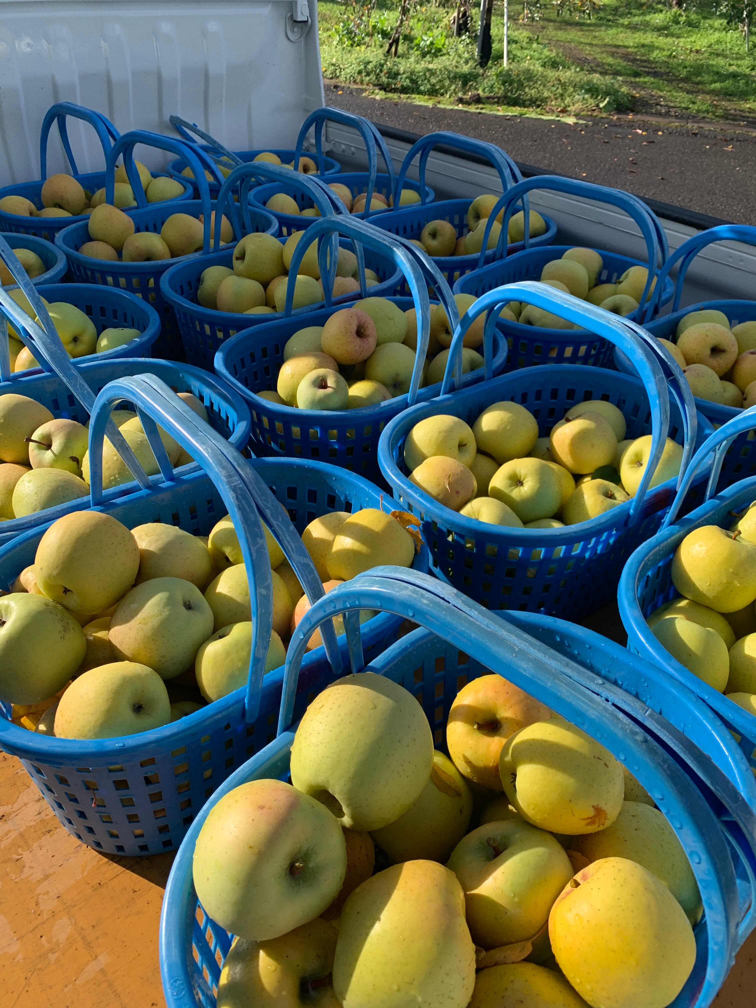 見た目は、シナノゴールド?ぐんま名月?のような果皮が黄色から黄金色で、お日様が当たった面には赤みが差します。